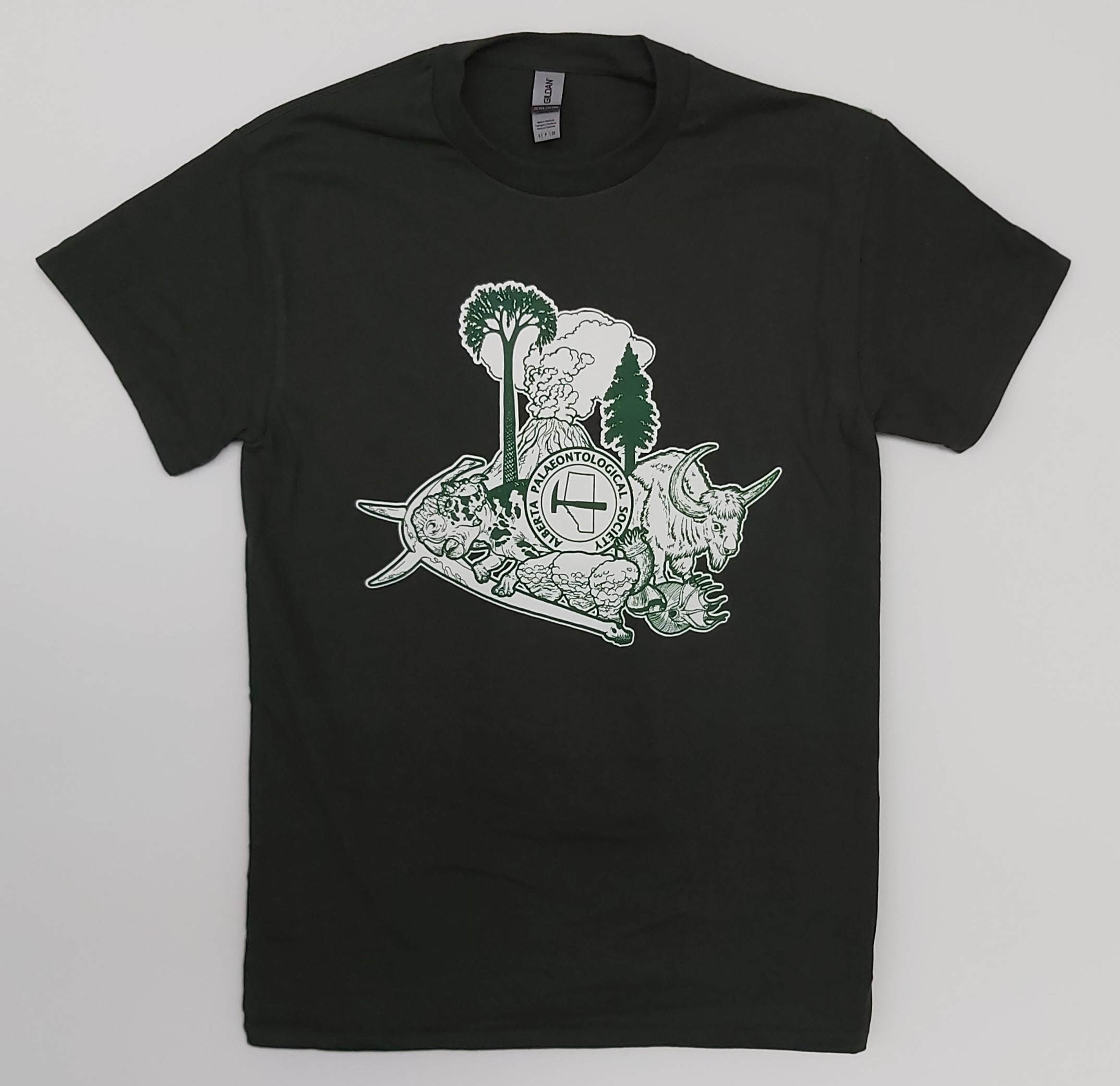 "The new t-shirt design is meant to celebrate the diversity of Alberta’s prehistory and connections with our neighbouring regions. Flanking the APS logo to the left and right are a Pachyrhinosaurus lakustai from Pipestone Creek and a Bison latifrons, the ice-age longhorn buffalo that ranged across North America. Beneath the Pachyrhinosaurus is Albertonectes vanderveldei from the Bearpaw Formation, which is the world’s longest known elasmosaur. Beneath the Bison are a representative rugose coral, brachiopod, and scaphite ammonite. Directly beneath the APS logo are stromatolites, referencing the 1.1-billion-year-old Siyeh Formation fossils found in the Waterton-Glacier International Peace Park and Castle Wildland Provincial Park area. Above the Pachyrhinosaurus is a giant lycopod tree like Lepidodendron or Sigillaria, representing the Stigmaria site that used to exist in Canyon Creek. Stigmaria is the name assigned to the root fossils of these ancient lycopods. One of less than a handful of Stigmaria sites in Canada, the site in Canyon Creek was apparently wiped out by the 2013 floods. Above the Bison is a Metasequoia tree, the leaves, twigs, and cones of which are common Late Cretaceous and Early Cenozoic fossils in Alberta. Between them is a volcano representing the 110-million-year-old eruption in the Cranbrook, B.C., area that deposited the Crowsnest Volcanics here in Alberta. Blairemorite is a rare volcanic rock known only from the Crowsnest Volcanics site in the Crowsnest Pass and the Lupata Gorge in Mozambique. The volcano is also a tribute to late APS member Phil Benham, who had a passion for climbing volcanoes around the world and passed away earlier this year."